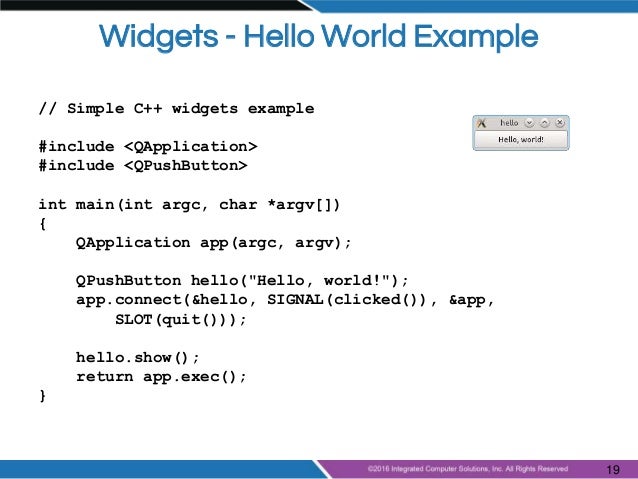 PyQt is more versatile than C/Qt in this regard, because we can connect not just to slots, but also to any callable, and from PyQt 4.2, it is possible to dynamically add 'predefined' signals and slots to QObjects. Let's see how signals and slots works in practice with the Signals and Slots program shown in Figure 4.6. In this tutorial we will learn How to use signal and slots in qt. File-New File or Project Applications-Qt Gui Application-Choose We keep the class as MainWindow as given by default. Note that slots are normal C functions, so Qt is not able to perform any special logic (like calling the connected slots): Slots are normal C functions and can be called normally; their only special feature is that signals can be connected to them. The connection mechanism uses a vector indexed by signals. But all the slots waste space in the vector and there are usually more slots than signals in an object. So from Qt 4.6, a new internal signal index which only includes the signal index is used. While developing with Qt, you only need to know about the absolute method index.